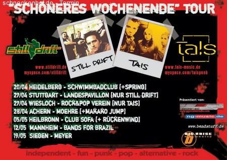 Die "Schöneres Wochenende" Tour 07 kann beginnen, mit "STILL DRIFT" und "TAIS" in der Hauptrolle. Den Part Vorband wird am Freitag "SPRING" übernehmen.*** www.stilldrift.de oder www.myspace.com/stilldrift *** *** www.tais-music.de oder www.myspace.com/taispunk *** 0 Kommentare zu diesem Event